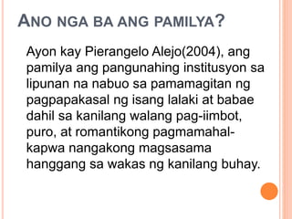 Ang ating mga pamilya ang nagsisilbing unang guro sa atin. Sa katunayan sa sinaunang panahon ang ekspresyon ay kasama ang mga kamag-anak at tagapaglingkod sa bahay ng panginoon. Bakit Mahalaga Ang Pamilya.