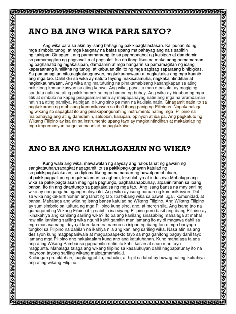 View ANO ANG WIKA PARA SAYOdocx from FIMSO 105 at Mindanao State University Main Campus. Kaya ang maisasagot ko kung nagagamit ba natin ito sa ating pang araw araw ay Oo ginagamit natin ito at. Ano ang Wika.